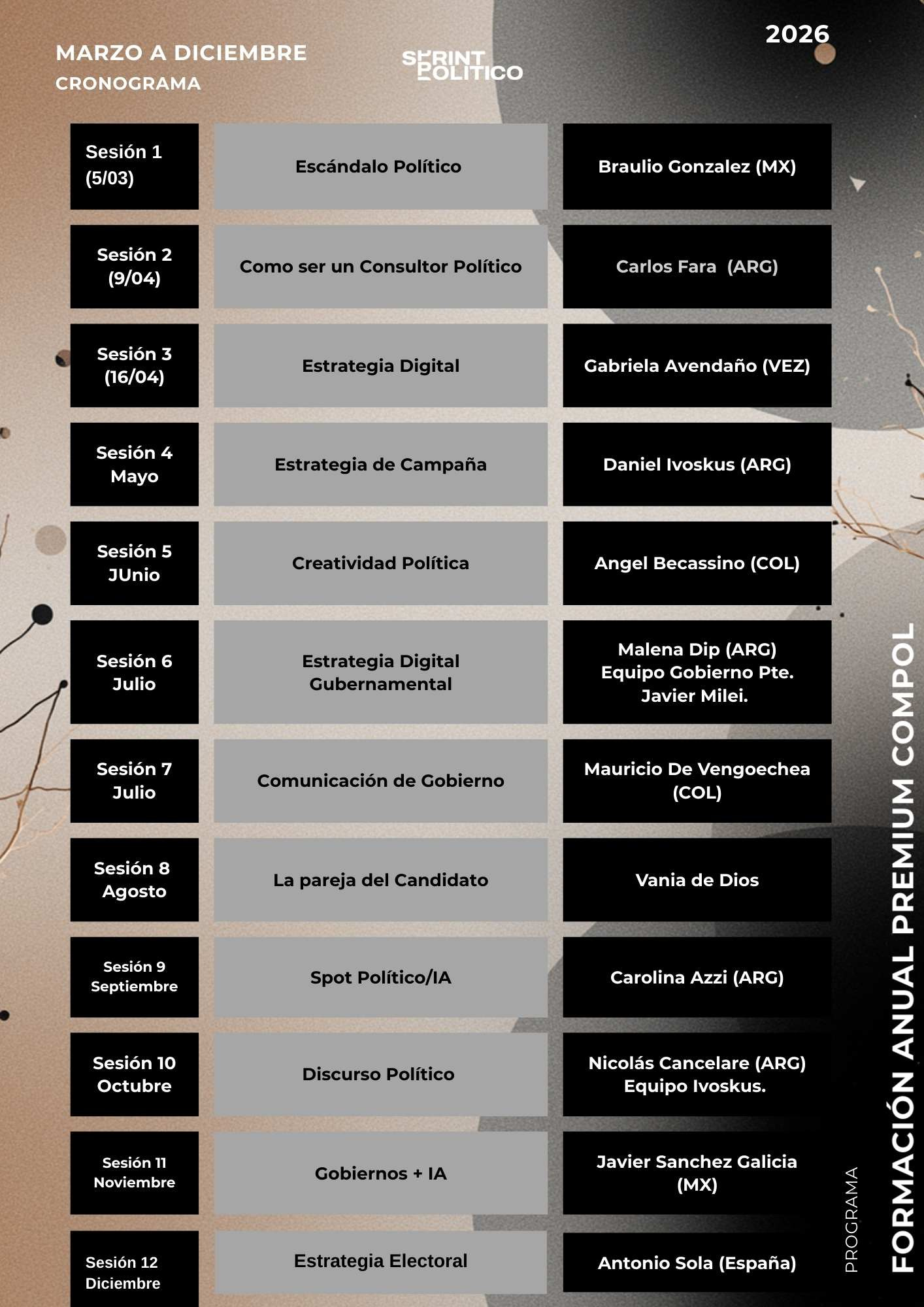 Las clases las dictan los mejores consultores y estrategas políticos: personas que toman decisiones, trabajan con equipos, conocen los tiempos, las tensiones y los errores reales del oficio y están trabajando actualmente en campañas presidenciales.